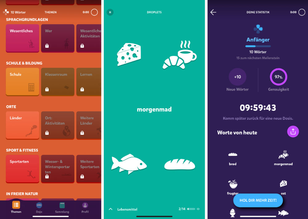 Wer die App mehr als nur 5 Minuten pro Tag verwenden möchte, ist auf ein kostenpflichtigs Abonnement angewiesen, das mit 10,99 Euro/Monat oder jährlich mit 76,99 Euro zu Buche schlägt. Grafisch ist Droplets auf jeden Fall sehr gelungen, und auch mit täglichen fünf Minuten für ein paar Vokabeln und Anwendungsbeispiele sollte man als junger Anfänger gut zurechtkommen. Einen Blick ist Droplets daher auf jeden Fall wert.