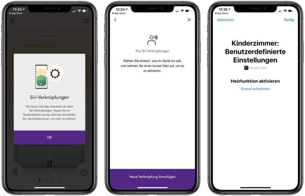 Welche Siri-Kurzbefehle ihr anlegt, bleibt natürlich euch überlassen und ist von Gerät zu Gerät unterschiedlich, immerhin bietet Dyson seinen Luftreiniger ja auch mit Heizfunktion.