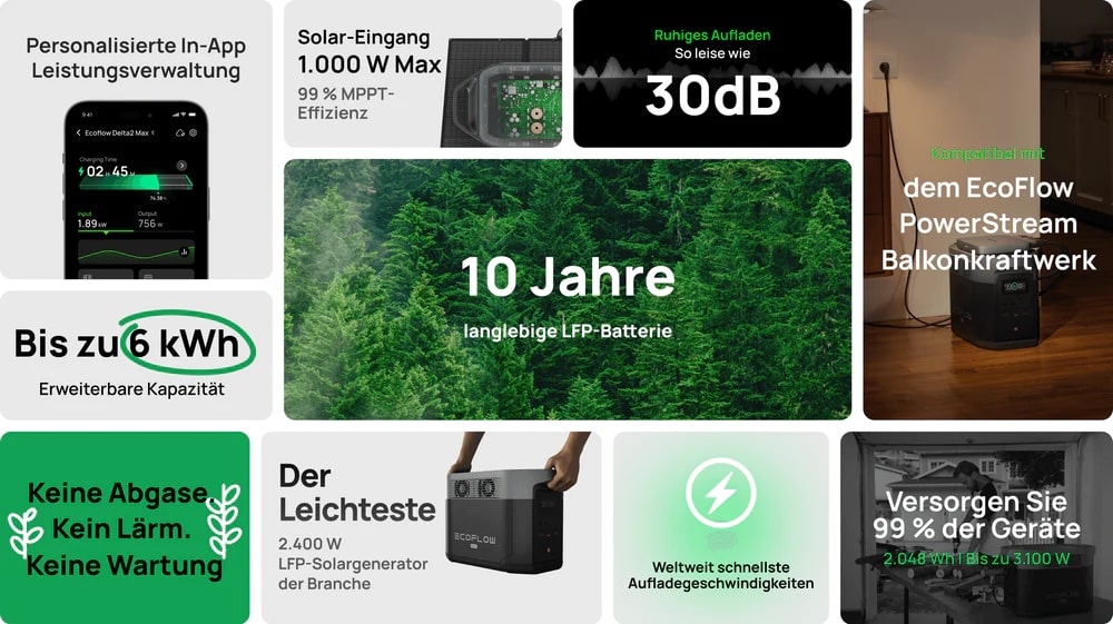 Passend dazu hat EcoFlow in dieser Woche bereits eine neue Powerstation vorgestellt, die mit dem PowerStream-System kompatibel sein wird: Die EcoFlow Delta 2 Max. Die EcoFlow Delta 2 Max wird ab dem 31. Mai im EcoFlow-Shop und über Amazon erhältlich sein und verfügt über eine Kapazität von 2 Kilowattstunden, die per Extra-Batterien auf bis zu 6 Kilowattstunden erweitert werden kann.