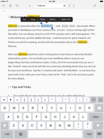 Neben dem .md-Format für Markdown-Texte kann Editorial allerdings auch Nutzer beglücken, die ihre Texte in einem .txt-Format erstellen und verwalten wollen. Dazu steht unter anderem eine Drpbox-Anbindung bereit, um Dokumente von dort zu importieren, oder später auch exportieren zu können. Auch ein Versand per E-Mail ist in der Editorial-App vorhanden.