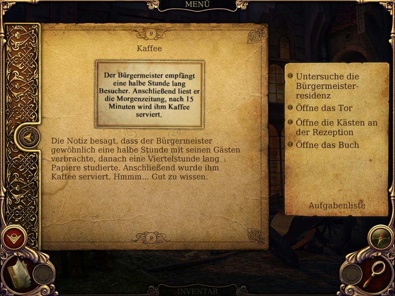 Bereits in der ersten halben Stunde habe ich einige spannende Rätsel absolviert, bei denen man sich teilweise in anderen Räumen nach passenden Gegenständen umsehen muss, um die richtige Lösung zu finden. Und auch danach geht es schnell weiter: Man findet immer mehr Einzelheiten über das blutrünstige Monster heraus. Dabei befragt man auch andere Charaktere, wobei alle Dialoge und Menü-Beschriftungen in deutscher Sprache gehalten sind.