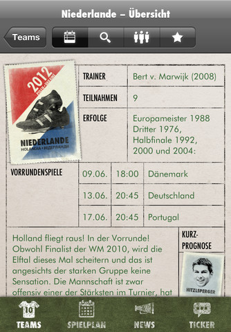 Die kostenlose iPhone-App versorgt euch unter anderem mit interessanten und äußerst humorvoll verfassten Hintergrundinfos zu den 16 teilnehmenden Teams. Neben einer Mannschaftsvorstellung wird unter anderem ein Spieler jeder Nation besonders hervorgehoben.