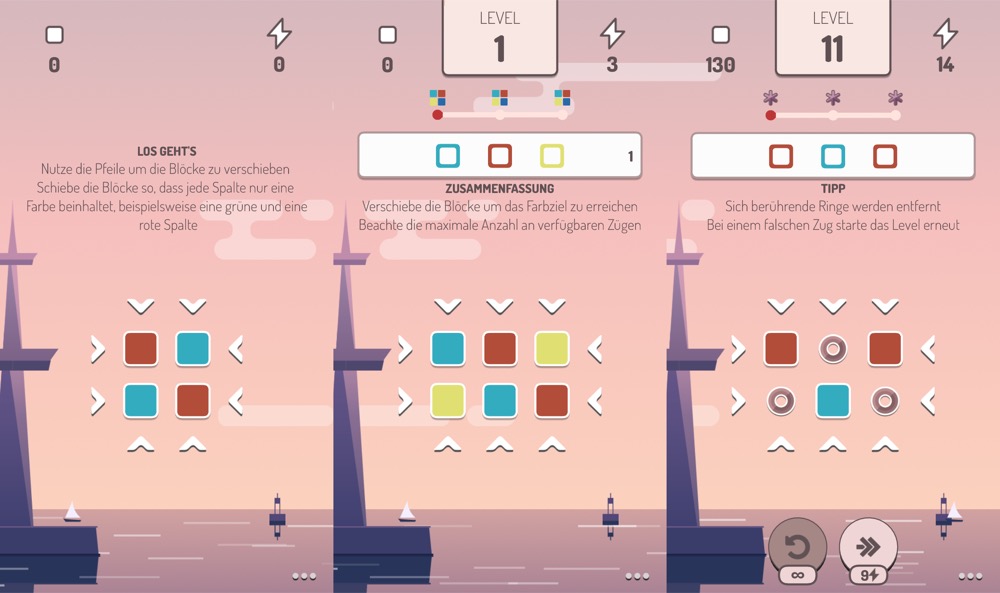 Die Spielmechanik von Ermo ist dabei schnell erklärt: Bunte Blöcke müssen über Fingertipps auf Pfeile so verschoben werden, dass alle Spalten in den richtigen Farben geordnet sind. Wie genau das Ergebnis aussehen soll, wird jeweils vom Spiel vorgegeben.