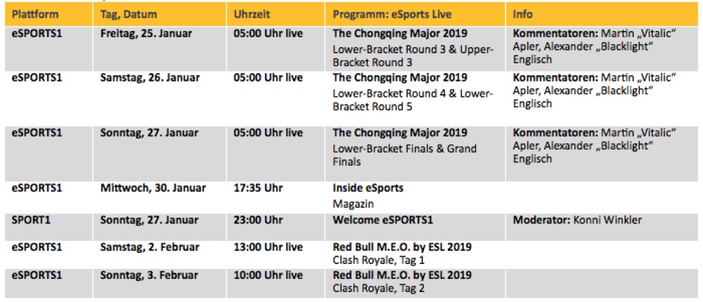 In den kommenden Wochen gibt es dann bereits einige Leckerbissen für eSports-Fans im Fernsehen zu sehen. Zu den kommenden Programmhighlights zählen unter anderem das „Red Bull M.E.O. powered by ESL“ (Clash Royale), die ESL One Katowice 2019, die Highlights der TAG Heuer Virtual Bundesliga und das neue eSports-Magazin „Inside eSports“. Bis zum gestrigen Sonntag, dem 27. Januar 2019, war außerdem bereits das Dota 2-Event „The Chongqing Major“ live aus China zu sehen.