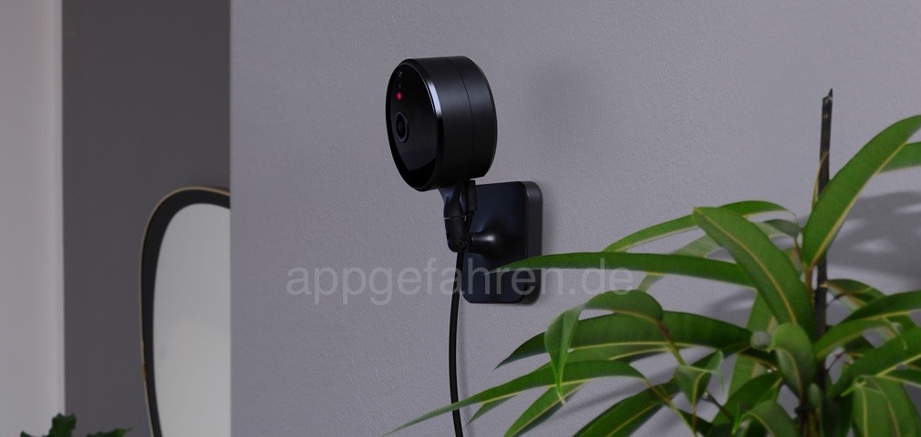 Ein weiteres Produktfoto, das wir im Netz auffinden konnten, zeigt die Eve Cam an einer Wand montiert. Der Standfuß scheint sich also auch zur Wandmontage zu eignen, zudem lässt sich der Fuß knicken und mutmaßlich auch drehen. Die Stromversorgung der Kamera erfolgt mit einem Kabel. Außerdem ist auszugehen, dass die Kamera neben einem Mikrofon auch über einen integrierten Lautsprecher und einen Bewegungssensor verfügt.