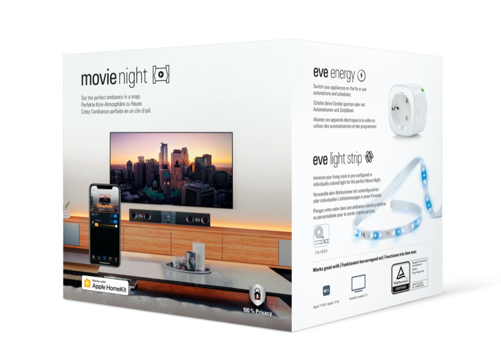 Eve Movie Night ist ein Bundle bestehend aus dem zwei Meter langen LED-Streifen Eve Light Strip und dem smarten Zwischenstecker Eve Energy. Die unverbindliche Preisempfehlung für die Produkte liegt bei 79,95 Euro beziehungsweise 49,95 Euro, wobei man bei einem Einzelkauf im Internet bei den preisgünstigsten Händlern für beide Produkte aktuell gut 110 Euro zahlen würde.