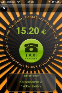 Mit dem Taxometer (App Store-Link) kann man ungefähre Taxi-Kosten berechnen. Dazu gibt man vor Fahrtantritt einfach das Ziel ein, als Start wird entweder die aktuelle Position oder eine ebenfalls manuell eingetragene Adresse gewählt. Nach einigen Sekunden wird der ungefähre Preis angezeigt. In unserem damaligen Test lag die Abweichung bei unter einem Euro.