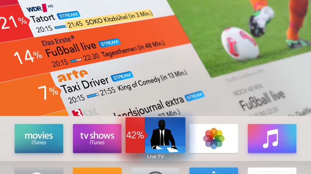 Die Live TV-App (App Store-Link) ist zum Start des Apple TV 4 als Launch-Titel verfügbar. Bevor wir uns die Frage nach dem „Warum?“ stellen, erst einmal die Fakten. Live TV bietet auf dem Apple TV Zugriff auf 70 Original-Streams der TV-Sender. Zusätzlich gibt es eine Live TV Quote, die die beliebtesten Free TV-Sendungen anzeigt. Live TV gibt’s ab sofort im AppStore auf dem neuen Apple TV. 10 Tage lang kostenlos und ohne Anmeldung ausprobieren. Danach gibt’s die Live TV App zum Einführungspreis von nur 19,99 Euro pro Jahr, oder man kann weiterhin eine wechselnde Auswahl einzelner Streams kostenlos starten.