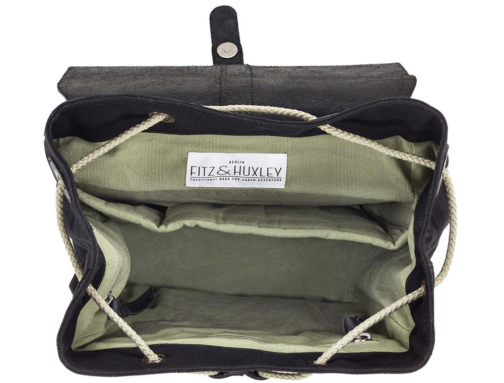 Der Rucksack selbst wirkt ausgesprochen hochwertig verarbeitet, das verwendete Segeltuch und das schwarz gefärbte Glattleder machen gleich einen sehr guten ersten Eindruck. Verschlossen wird der Lederdeckel mittels eines runden Magneten, das große Innenfach ist mit einem Kordelzug versehen und lässt sich entsprechend zusammenziehen. Im Inneren ist der Equinox mit einem hellgrünen Leinenstoff ausgestattet, der es deutlich vereinfacht, Kleinigkeiten in der Tiefe des Rucksacks wiederzufinden. Auf der Rückseite des Innenfachs gibt es zudem einen separaten, leicht gepolsterten Einschub für ein MacBook mit bis zu 13 Zoll Bildschirmgröße.