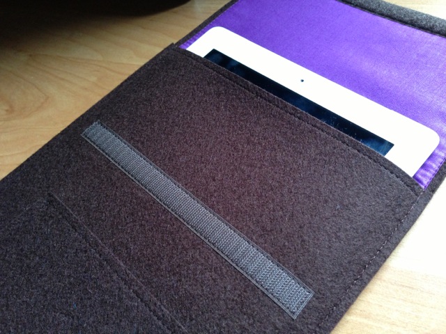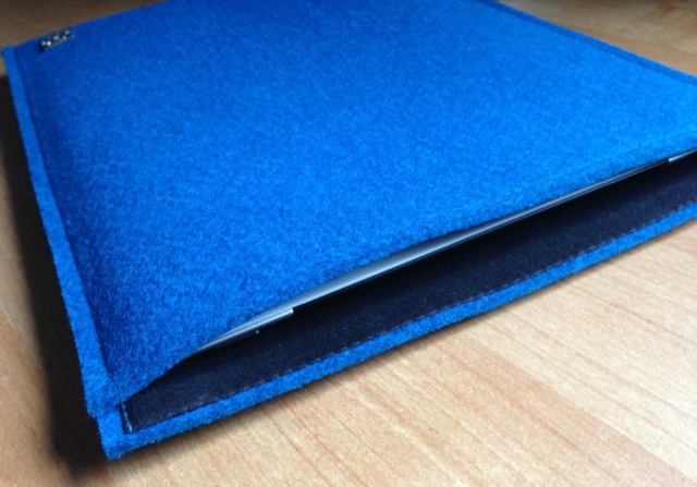 Anders als in der iPhone-Variante wurde für die iPad-Taschen etwa 4 mm dickes, aber ebenso weiches, hochwertiges Wollfilz verwendet. Auch die Farben sind ähnlich kräftig und kommen gut zur Geltung. Das Sleeve Bern V zum Einschieben des iPad 3/4 verfügt über ein schwarzes Innenfutter und eine verlängerte Rückseite, so dass das Tablet einfacher entnommen werden kann. Nach dem Einschieben in das Sleeve verschwindet das iPad komplett in der Tasche – allerdings sitzt es für meinen Geschmack einen Tick zu locker, so dass es beim Umdrehen der Tasche leicht herausfällt. Findige Kreative können vielleicht eigenhändig noch einen Verschluss annähen, beispielsweise mittels einer Lasche oder eines Knopfes, um das iPad am herausrutschen zu hindern. Andererseits lässt sich so auch das iPad samt angelegtem Smart Cover im Bern V-Sleeve transportieren: Zwar sitzt das Tablet relativ fest in der Hülle, aber das flexible Filzmaterial sollte sich nach einigem Gebrauch erwartungsgemäß an die Maße des iPads plus Cover anpassen.