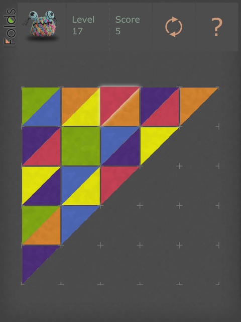 Das Spielprinzip von Folds ist ebenso einfach wie schwer zu meistern: Es gilt, farbige Dreiecke zusammen zu falten und diese damit vom Spielfeld zu löschen. Auf dem mit 5 x 5 Feldern bestückten Spielbrett müssen die jeweils zwei Dreiecke pro quadratischem Feld vom Spieler so geschickt platziert werden, dass sich zwei gleichfarbige Dreiecke in einem Quadrat wiederfinden, und diese dann gelöscht werden können.