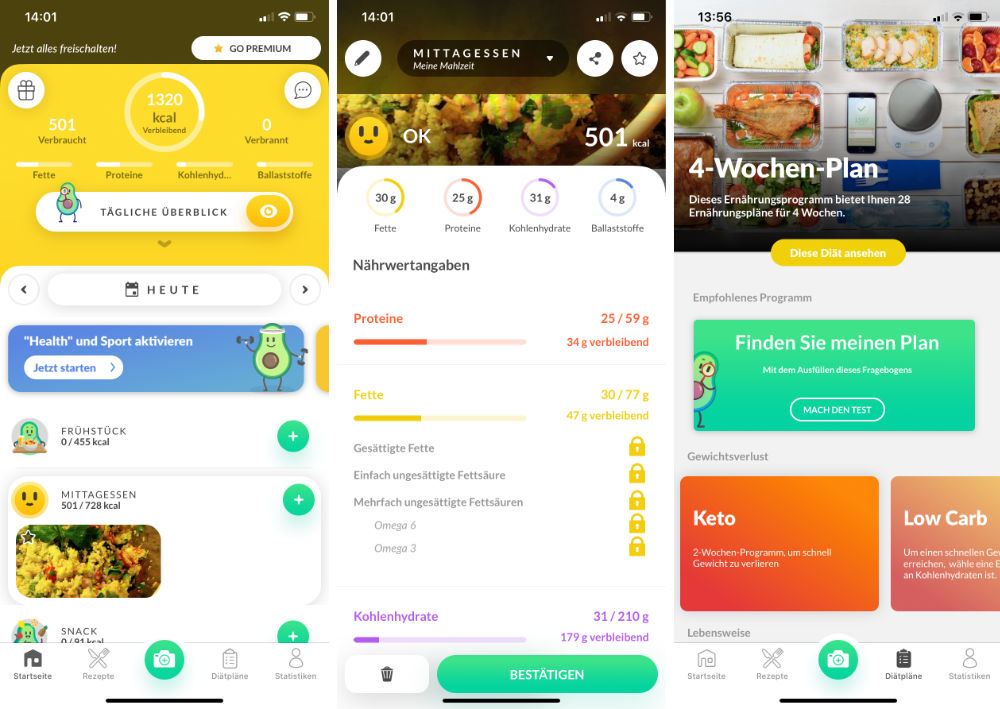 Foodvisor gliedert sich grob in mehrere große Teilbereiche: Eine Startseite, auf der alle wichtigen Infos zu den heutigen Mahlzeiten im Überblick dargestellt werden, dazu ein Rezepte-Menü (eingeschränkt nutzbar für Gratis-User) mit gesunden Mahlzeiten und ihrer Zubereitung, Diätpläne und Statistiken. Darüber hinaus gibt es mit einem Kamera-Button das Herzstück der Ernährungs-App: Auf diese Weise soll der Nutzer seine Mahlzeiten fotografieren, sie von der App erkennen lassen und so bequem entsprechende Nährwerte auf einen Blick geliefert bekommen.