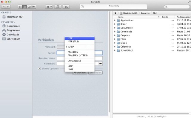 Eine dieser Optionen ist die Integration von externen Servern und Festplatten, auf die mit der ForkLift-App zugegriffen werden kann. Unterstützt werden FTP, SFTP, WebDAV, Amazon S3, iDisk, SMB, AFP und NIS. Dazu gibt es eine Favoriten-Funktion, und einen App Deleter, der automatisch mit dem Programm verbundene Einträge löscht.