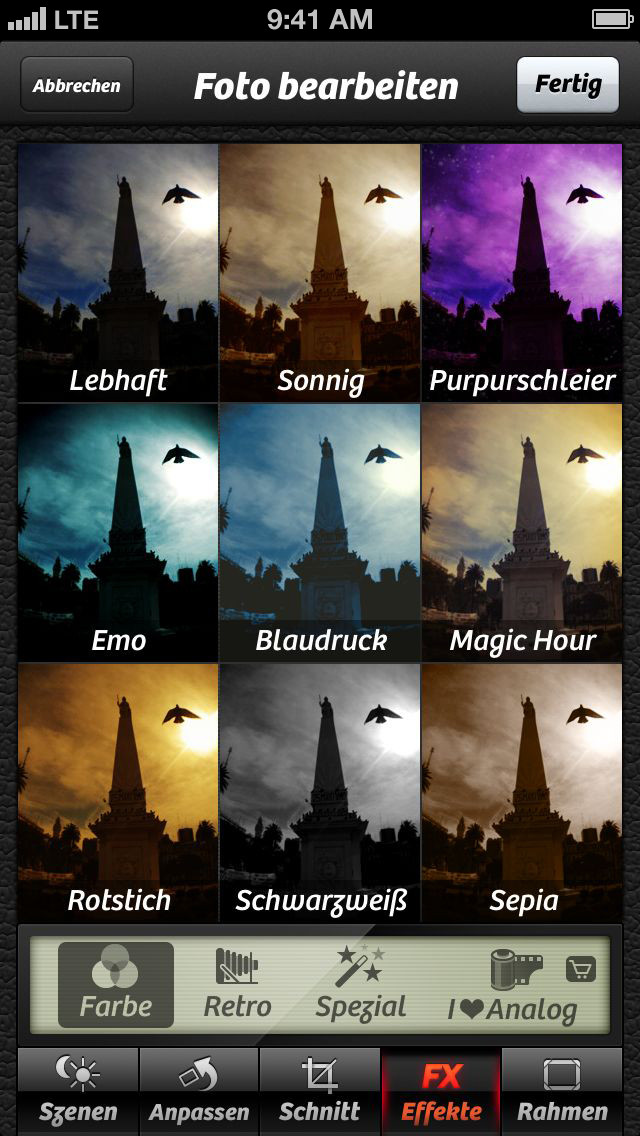 Ab sofort können Effekte sogar übereinander gelegt und gemischt werden, um ein noch besseres Ergebnis erzielen zu können. Mit dem Hollywood FX Pack, das auf dem iPhone für 89 Cent per In-App-Kauf zum Download bereitsteht (auf dem iPad kostenlos), erhält man neun neue Filter für die Bildbearbeitung. Als Vorbild dienen natürlich die Effekte beliebter Filme und TV-Serien.