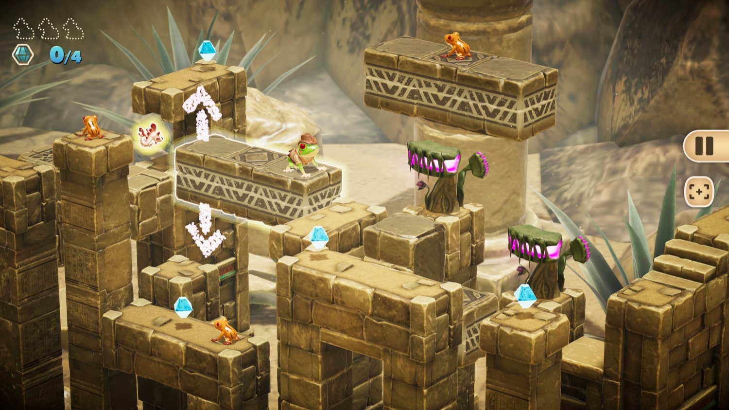 Per Fingertipp wird Frogger durch die Gegend bewegt und muss nicht nur zum Ziel kommen, sondern im besten Fall auch alle Edelsteine aufsammeln. Diese sind zum Teil wirklich gut versteckt, so dass man die Kamera drehen, bewegen und zoomen muss, um alle Winkel des jeweiligen Levels abzusuchen.