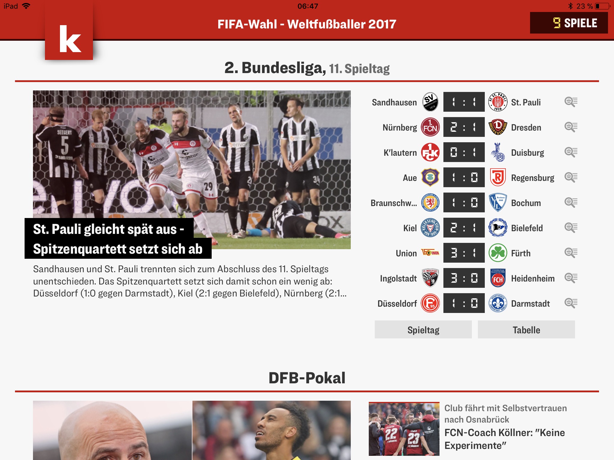 Heute Abend muss unser geliebter VfL Bochum im DFB-Pokal gegen Paderborn ran. Eine erste Anlaufstelle rund um News, Ergebnisse und Tabellen ist sicherlich das Fußballmagazin kicker (App Store-Link). Mit dem Update auf Version 5.0 kann die kicker-App jetzt auch auf dem iPad genutzt werden. Hier profitiert man von einer erweiterten Darstellung im Querformat, da deutlich mehr Informationen abgefunden werden können. Zusätzlich haben die Macher die App grafisch verbessert und die Nutzung optimiert.