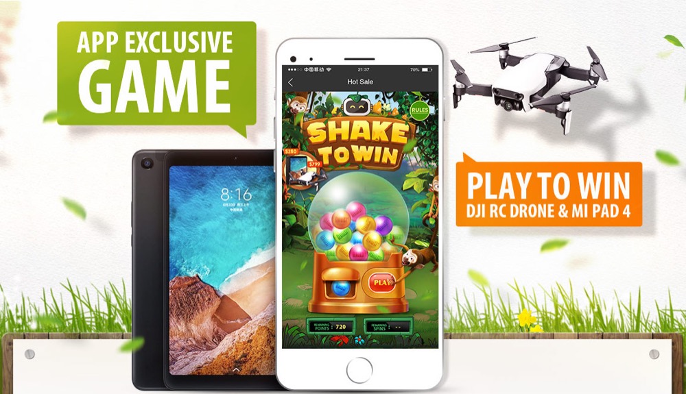 Des Weiteren gibt es ein App-exklusives Spiel, bei dem ihr eine DJI RC Drohne oder ein Mi Pad 4 gewinnen könnt. Ihr könnt täglich in der App das Spiel starten, müsst dafür aber einen Account bei Gearbest haben. Ihr müsst einfach euer Smartphone schütteln und mit etwas Glück werdet ihr als Gewinner gezogen.