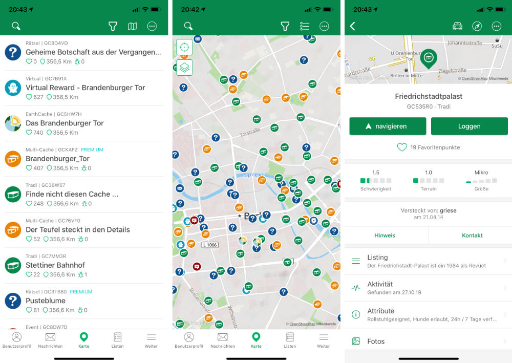 Wer mit dem Geocachen anfangen will, landet zumeist bei der offiziellen Geocaching-App des Betreibers Groundspeak. Der Download der App ist kostenlos, benötigt iOS 10.0 oder neuer sowie 118 MB an freiem Speicherplatz und lässt sich auch in deutscher Sprache verwenden. Für Geocacher, die keinen kostenpflichtigen Premium-Account bei Geocaching haben, bietet diese App zwar einen ersten guten Einstieg, allerdings auch die wenigsten verfügbaren Caches, die ohne Premium-Account gefunden werden können. Alle Basis-Funktionen sind vorhanden: Eine Suche nach Ort, GeoTour oder GC-Code, die Beschreibung des Caches mit allen relevanten Infos wie Schwierigkeitsgrad und Größe, Einsicht ins Benutzerprofil, Zugriff auf Nachrichten und (Online-)Listen, eine Live-Kartenansicht, Suche nach Trackables und die Möglichkeit, gefundene Geocaches oder Trackables zu loggen – und das auch mit angehängten Fotos.
