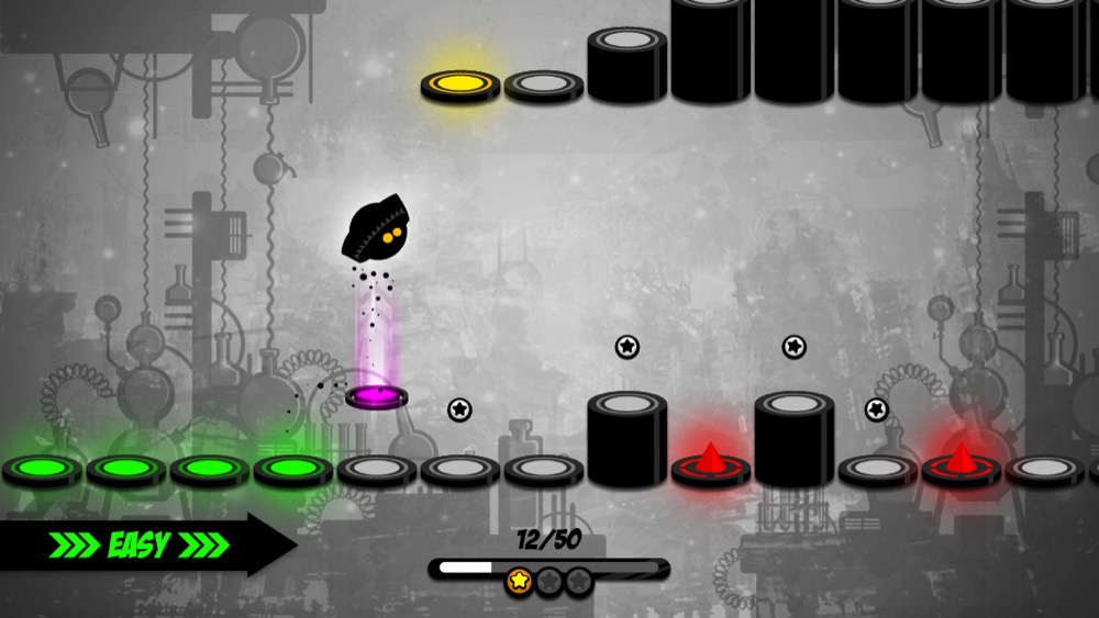 Das Ziel von Give It Up! 2 ist eigentlich relativ schnell erklärt: Man steuert den kleinen Tintenklecks Blob über verschiedene Plattformen und muss dabei unbedingt verhindern, mit spitzen Stacheln in Berührung zu kommen, die sich auf einigen der Plattformen befinden. Das klingt zunächst auch sehr einfach, doch der Teufel steckt wie immer im Detail. So kann der kleine Blob von allein kurze Sätze zur nächsten Plattform machen, benötigt aber für einen längeren Sprung einen im Rhythmus der Musik im Hintergrund ausgeführten Fingertipp auf das Display.