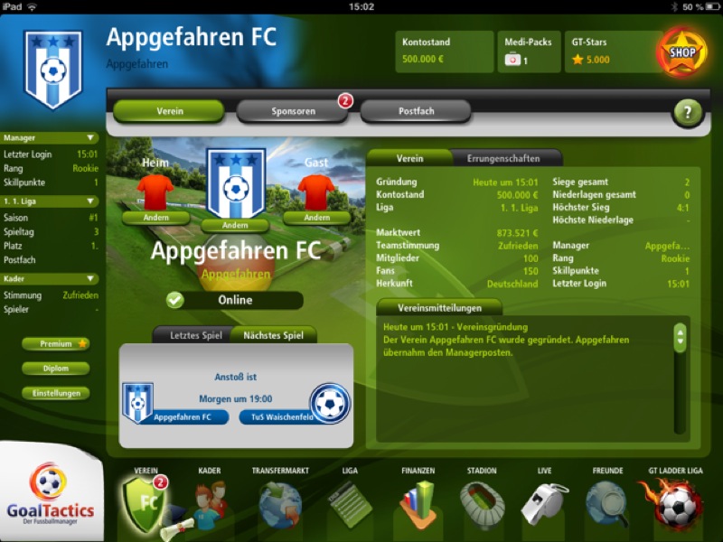 GoalTactics ist nur für das iPad konzipiert und sehr gut auf den großen Bildschirm des Apple-Tablets angepasst. Wie in klassischen Fußball-Managern (ich erinnere mich immer gerne an Anstoss 2 Gold), steuert man das ganze Geschehen von einem Übersichts-Screen aus. Bevor es soweit ist, muss man aber zunächst eine eigene Mannschaft gründen.