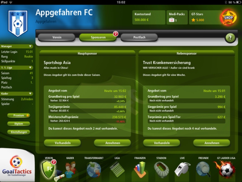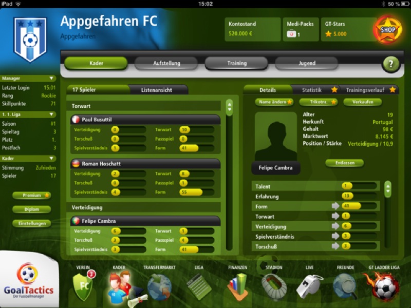 Aktuell sieht die Sache wie folgt aus: Mit einem Premium-Account erhält man nämlich nicht nur Trikotnummern für die Spieler oder kann eigene Spielernamen vergeben (das hat wirklich keinen Einfluss auf das Spiel), sondern bekommt auch mehr Filter auf dem Transfermarkt und doppelte Skillpunkte. Zudem kann man den Ausbau eines Stadions durch den Einsatz von kostenpflichtigen GT-Stars beschleunigen. Im Shop findet man zudem Medipacks, die vermutlich für eine schnellere Genesung verletzter Spieler dienen. Inwiefern das über einen längeren Zeitraum Einfluss auf das Spiel nimmt, können wir zum jetzigen Zeitpunkt noch nicht abschätzen.