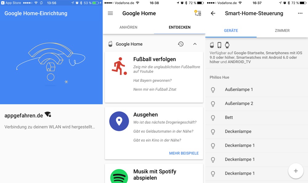 Ganz ähnlich verhält sich die Geschichte mit Smart Home Anbietern, bisher sind noch längst nicht alle bekannten Namen dabei. Neben Philips Hue, Tado, Nanoleaf, Netatmo oder WeMo findet man in den Einstellungen der Google Home App sehr viele unbekanntere Anbieter aus dem US-Markt. Die Integration von Philips Hue funktionierte zumindest bei mir problemlos, aber nicht zufriedenstellend: Es gibt aktuell keine Möglichkeit, die bereits in der Hue-App konfigurierten Räume zu übernehmen. Wer nur ein paar Hue-Lampen in ein oder zwei Räumen hat, den stört das nicht unbedingt – bei einer komplett ausgestatteten Wohnung sieht es schon anders aus.