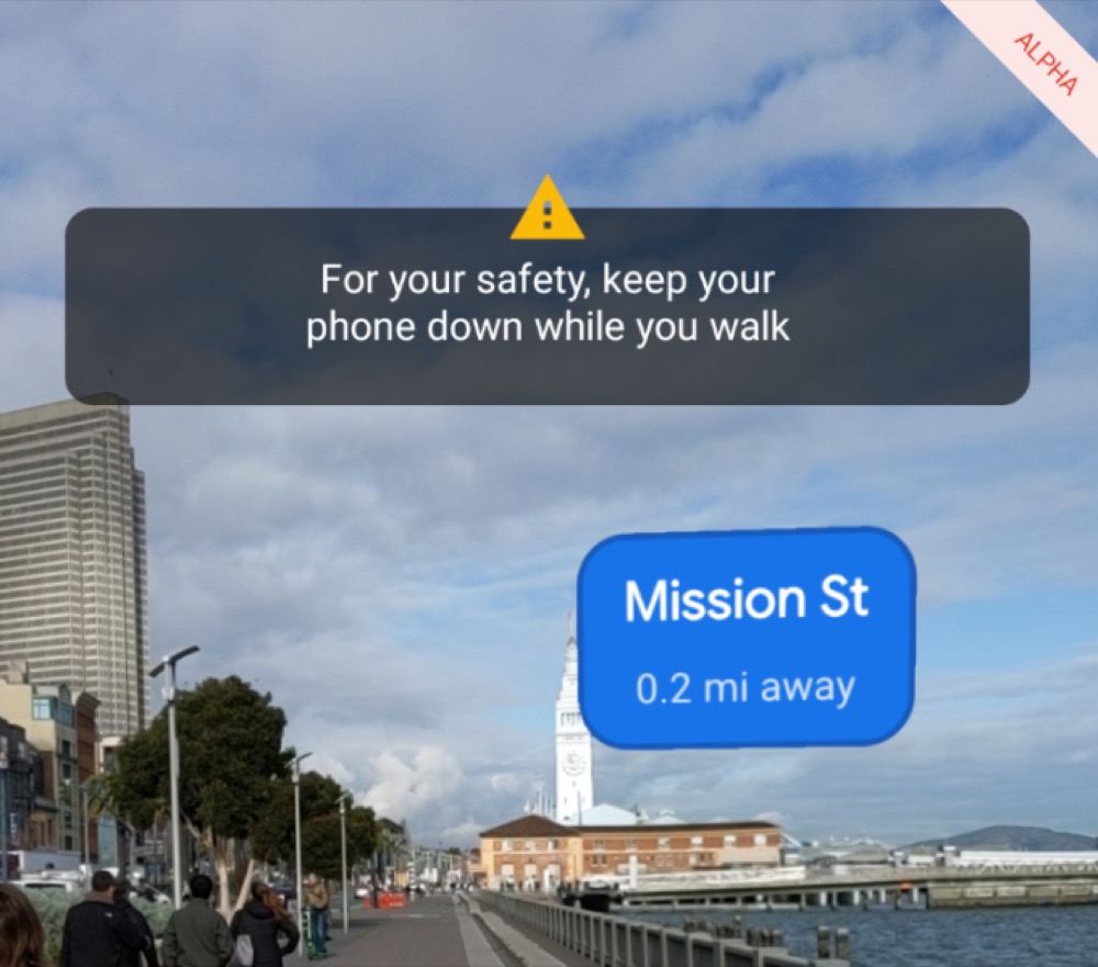 Neben einigen Änderungen am Interface der AR Walking Directions, um die Pfeile und Schilder für den Nutzer möglichst präzise und unmissverständlich darzustellen, hat das Team von Google in der letzten Zeit auch an der Handhabung der App gearbeitet. Denn: Die Navigationshinweise über Augmented Reality sollen nicht ständig angezeigt werden, damit der User nicht mit ständig erhobenem Smartphone durch die Gegend läuft. So erlebte Greg Kumparak bei seinem Test eine Sicherheitsmaßnahme von Google Maps mit automatischer Deaktivierung des AR-Modus nach einiger Zeit, zusammen mit dem Hinweis „Halte dein Handy zu deiner eigenen Sicherheit beim Gehen nach unten“.