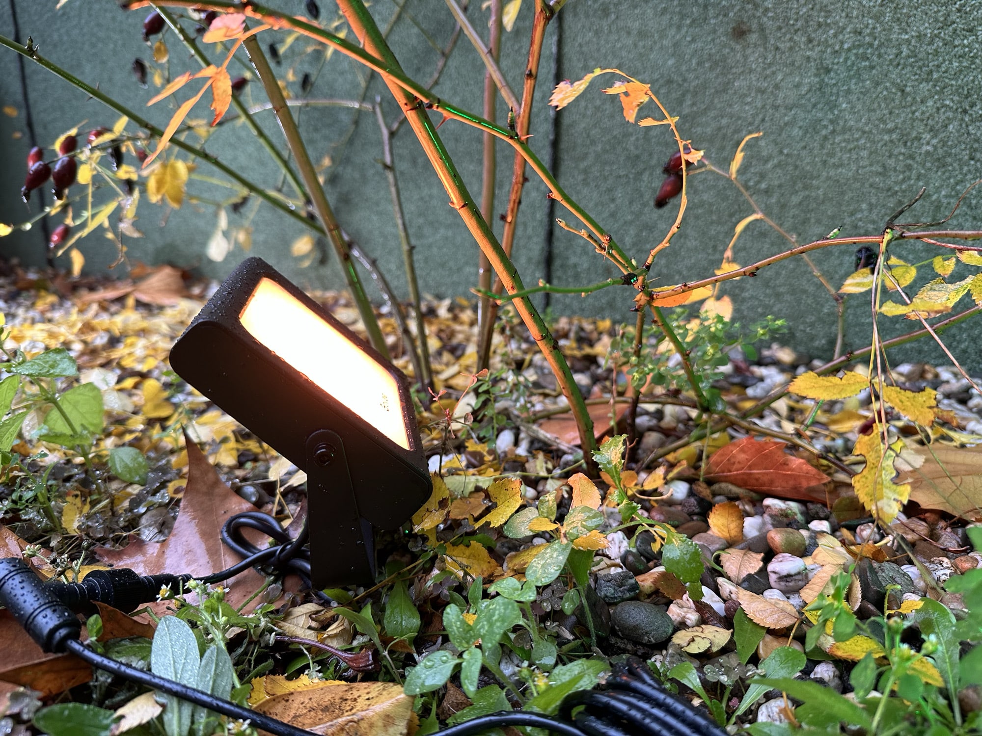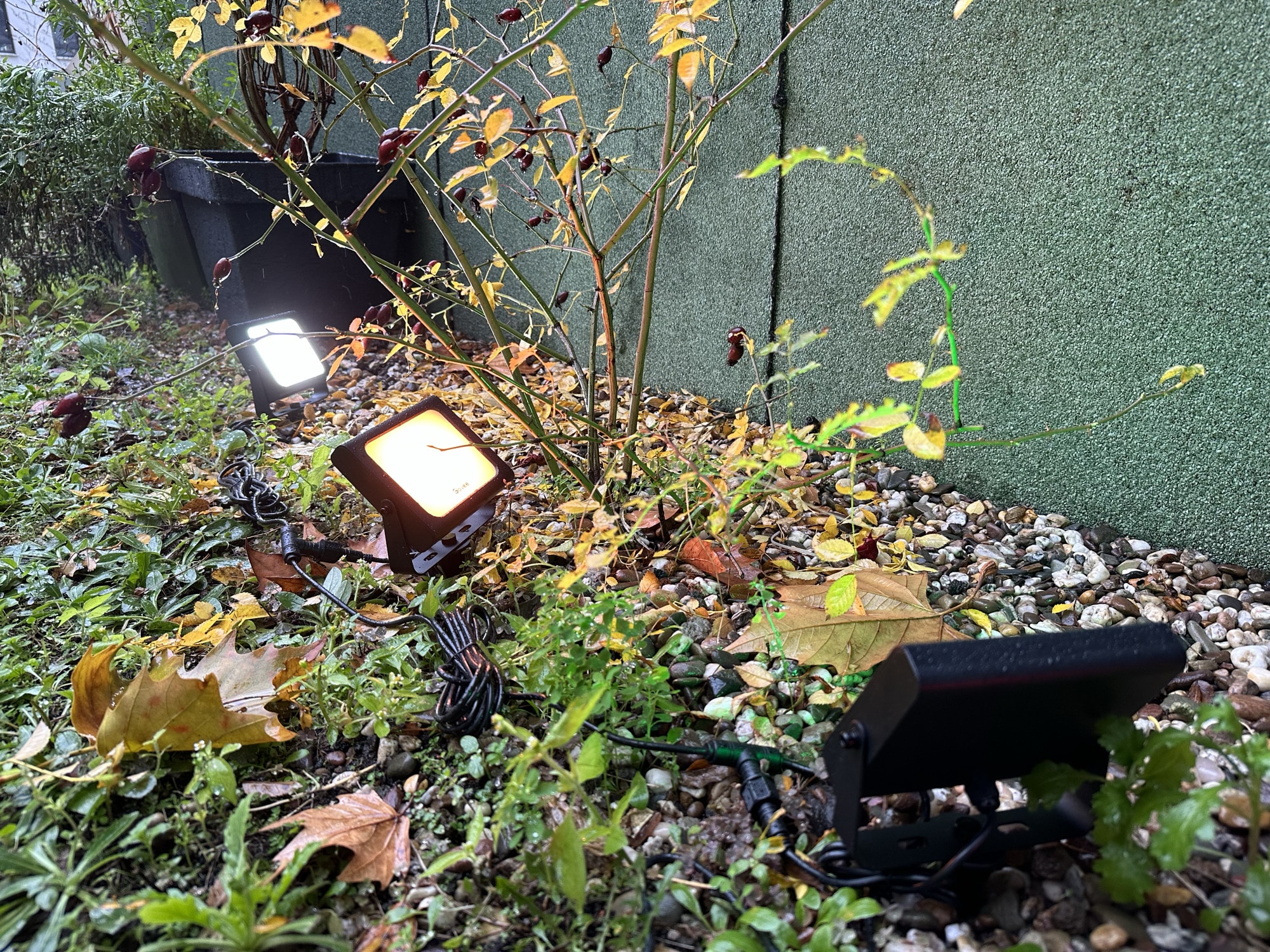 Jeder Strahler hat eine Lichtleitung von 500 Lumen und kann dabei Weißtöne und Farben (2200-6500K) darstellen. Die Farbwiedergabe ist in Ordnung, über den Controller am Kabel kann man die Lichter manuell an- und ausschalten, ebenso kann man zwischen Weiß und Farbe wechseln. Smarter wird das ganze aber über die Govee Home-App. Hier muss man ein Konto mit Name und E-Mailadresse anlegen, danach lassen sich die Flutlichter mit dem hauseigenen WLAN verbinden. Montiert man die Lichter in der hintersten Ecke im Garten, in der kein WLAN-Empfang verfügbar ist, kann man die Flutlichter aber über Bluetooth steuern. Sind die Strahler in WLAN Reichweite, lassen sich diese auch aus der Ferne steuern.
