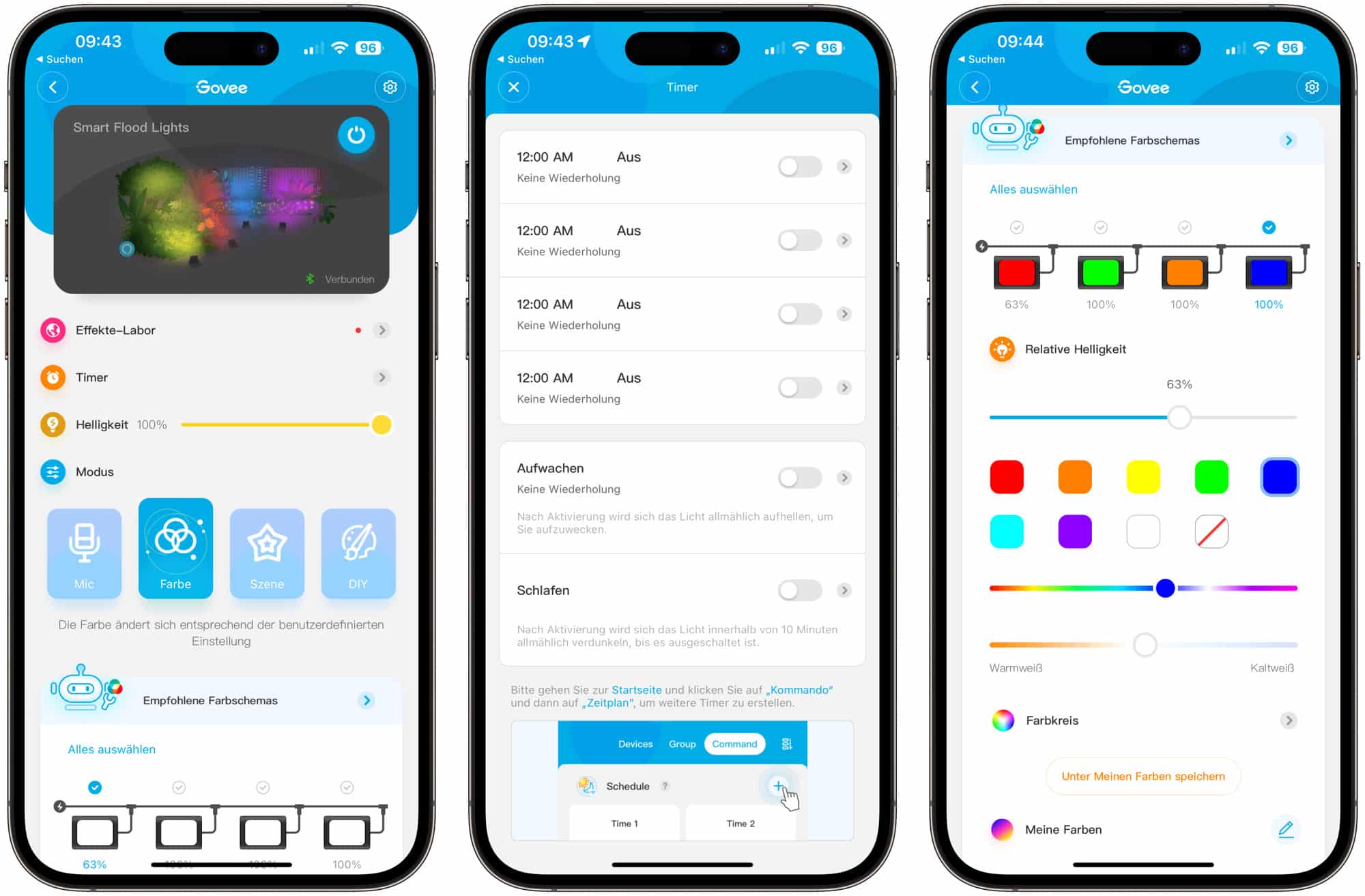 Die Einrichtung ist ein Kinderspiel. In der App stehen dann zahlreiche Funktionen zur Verfügung. So könnt ihr jedem Strahler eine eigene Farbe zuordnen, die Helligkeit individuell bestimmen oder die Flutlichter im Takt der Musik blinken lassen (es wird das Mikrofon vom iPhone verwendet). Zudem könnt ihr auf zahlreiche Szenen zurückgreifen, bei denen auch Farben durchgespielt werden. Wer möchte, kann auch eigene Szenen und eigene Farbverläufe- und wiedergaben anlegen. Über die Timer-Funktion könnt ihr die Flutlichter auch per Zeitplan automatisch steuern.