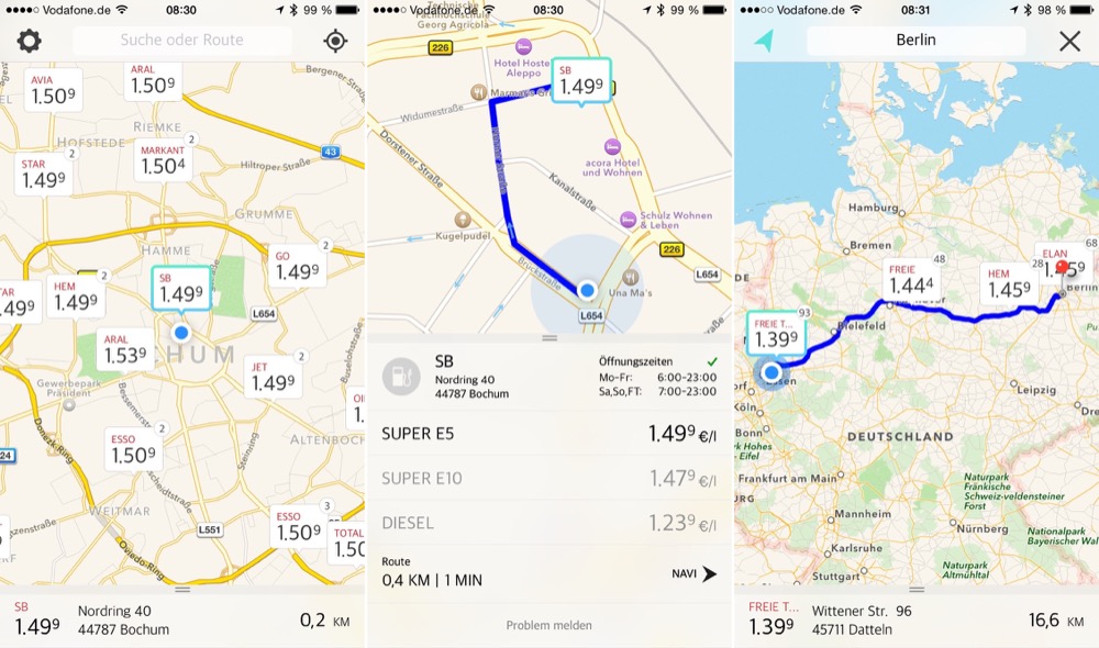 In den Details könnt ihr euch die weiteren Kraftstoffarten und Preise anzeigen lassen, auch die Öffnungszeiten und eine Navi-Funktion zur Tanke sind verfügbar. Des Weiteren bietet Spritradar eine Routen-Funktion. Wer eine Strecke von A nach B eingibt, bekommt alle Tankstellen entlang der Route samt Preis angezeigt – für den nächsten Urlaubstrip sehr praktisch.