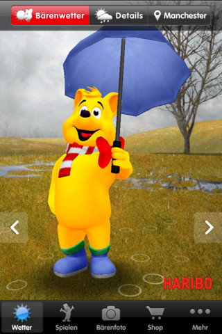 Manche mögen uns jetzt für verrückt erklären, aber es ist tatsächlich so. Zumindest wenn man die neue HARIBO App (App Store-Link) für das iPhone installiert. Das Wetter wird dort nämlich vom Goldbär präsentiert, der je nach Vorhersage eine Sonnenbrille trägt, einen Regenschirm mitnimmt oder sich auf eine Schlittenfahrt freut.