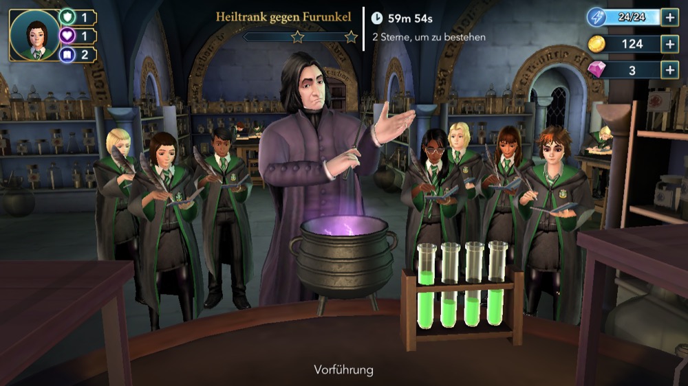 Bedingt durch den kostenlosen Download des Rollenspiel-Abenteuers hat man allerdings auch mit einigen Währungen zu leben, die den Spielverlauf beeinflussen können. So gibt es unter anderem blaue Energieblitze, Goldmünzen und auch pinke Diamanten, von denen einige per In-App-Kauf zu Preisen von bis zu 109,99 Euro erworben werden können. Vor allem Wartezeiten machen dem angehenden Zauberschüler das Leben oft schwer – und jede Aktion im Unterricht kostet einige Energiepunkte. Zwangsläufig wird man sich hier wohl mit einigen Wartezeiten arrangieren müssen, wenn man auf Zukäufe verzichten will. Fans der Harry Potter-Serie sollten diesem neuen Spiel aber definitiv eine Chance geben, denn Spaß macht es trotzdem.