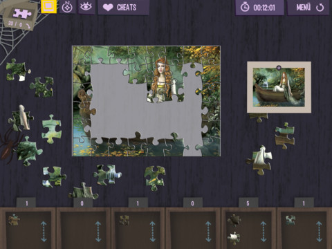 Auf dem weiß/grau hinterlegten Hintergrund muss das Bild in Home of Jigsaw Puzzle wieder zusammengesetzt werden, man kann sich natürlich das Original einblenden lassen. Außerdem gibt es am unteren Rand sechs Kisten, in denen man Puzzleteile beispielsweise mit der gleichen Farbe oder nur Randstücke sortieren kann, um den Überblick nicht zu verlieren. Des Weiteren stehen dem Nutzer Cheats zur Verfügung, die jedoch die Zeit nach oben schrauben. So kann man sich zum Beispiel alle Puzzlestücke richtig ausrichten oder alle Randstücke sortieren lassen.