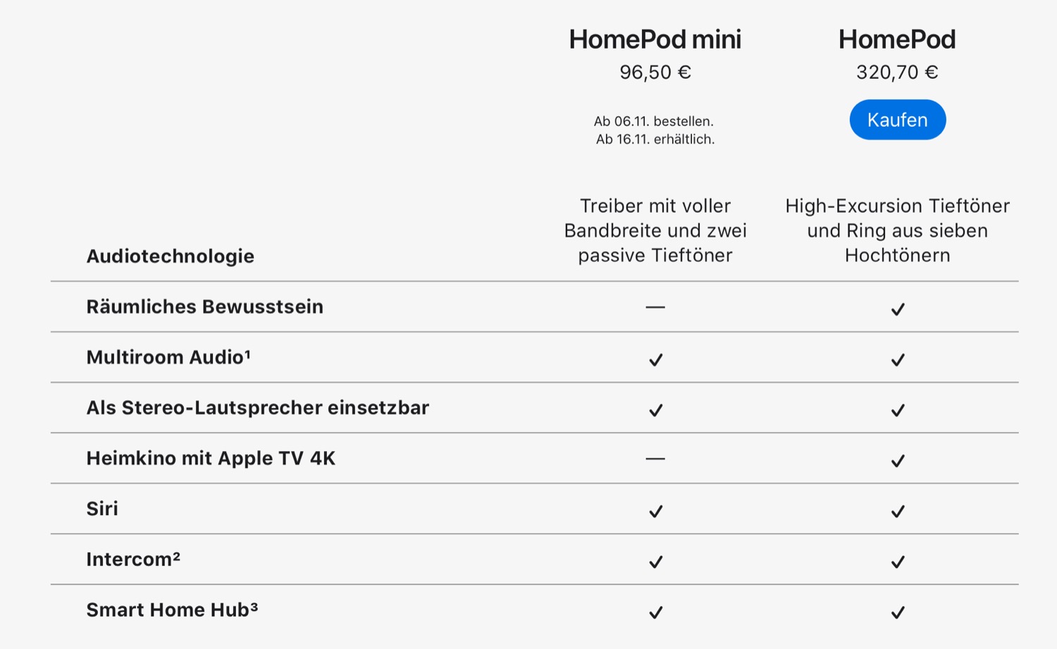 Mit etwas Abstand zur Keynote möchten wir heute noch einmal auf die Details des neuen HomePod Mini eingehen. Unter anderem liefert Apple eine übersichtliche Tabelle aus, die auf die Unterschiede zum großen HomePod eingeht. Während die Größe und die Form sofort ersichtlich sind, gibt es noch ein paar Details, die wir jetzt aufgreifen wollen.