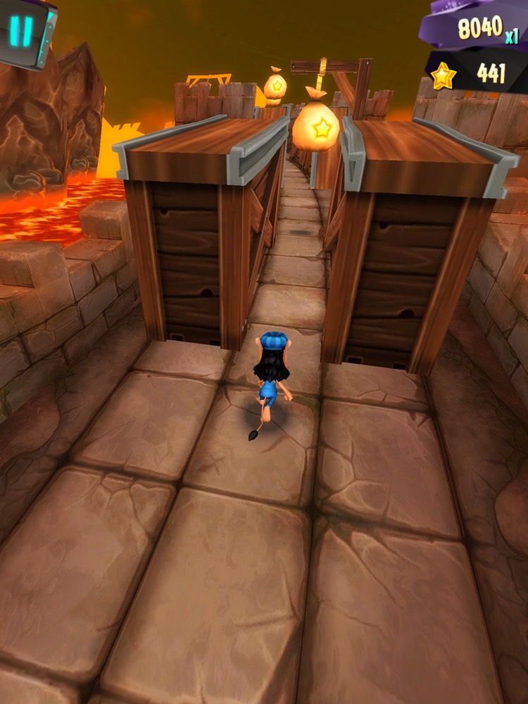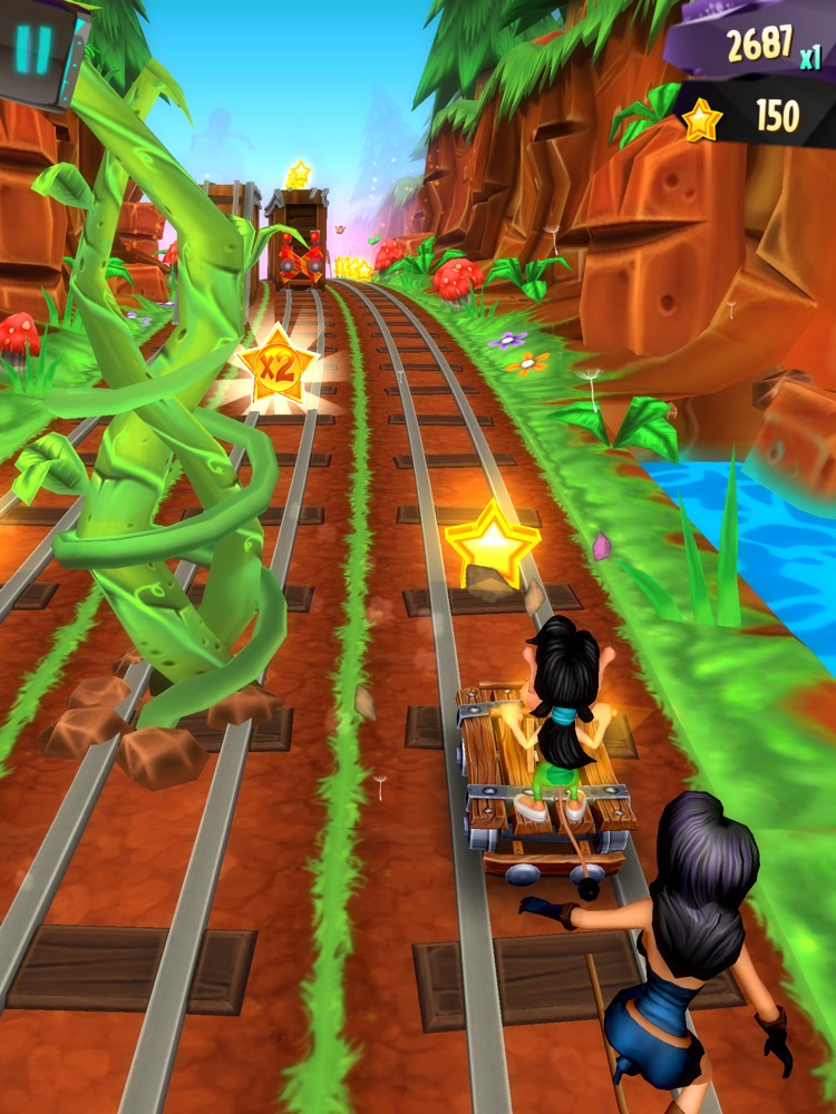 Wie bei vielen anderen Endless Runnern lässt sich auch Hugo Troll Race 2 ganz simpel mit den üblichen Wischgesten steuern: Zum Springen wird nach oben, zum Ducken nach unten gewischt, Richtungswechsel mit Gesten nach links und rechts unternommen. Viel mehr muss man eigentlich auch nicht wissen, um sich ins Abenteuer stürzen zu können. Unterwegs warten zudem kleine Power-Ups, aber auch Horden von Krokodilen, aus dem Boden herausbrechende Schlingpflanzen und Schienen, die ins Leere laufen – Schnelligkeit und Geschicklichkeit ist also auf jeden Fall gefragt.