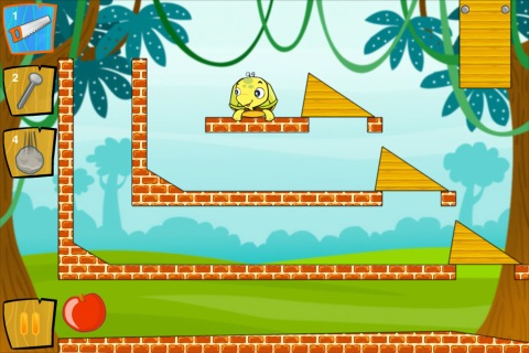 Denn: Ähnlich wie in vergleichbaren Physik-Puzzles wie etwa Crazy Machines muss man sich verschiedener Gegenstände bedienen, um die kleine Schildkröte zu ihrem geliebten Apfel zu führen, und somit das Level zu bestehen. In Hungry Turtle ist diese Auswahl übersichtlich: Es gibt eine Säge, Nägel und Steine/Blöcke zum herabfallen lassen.
