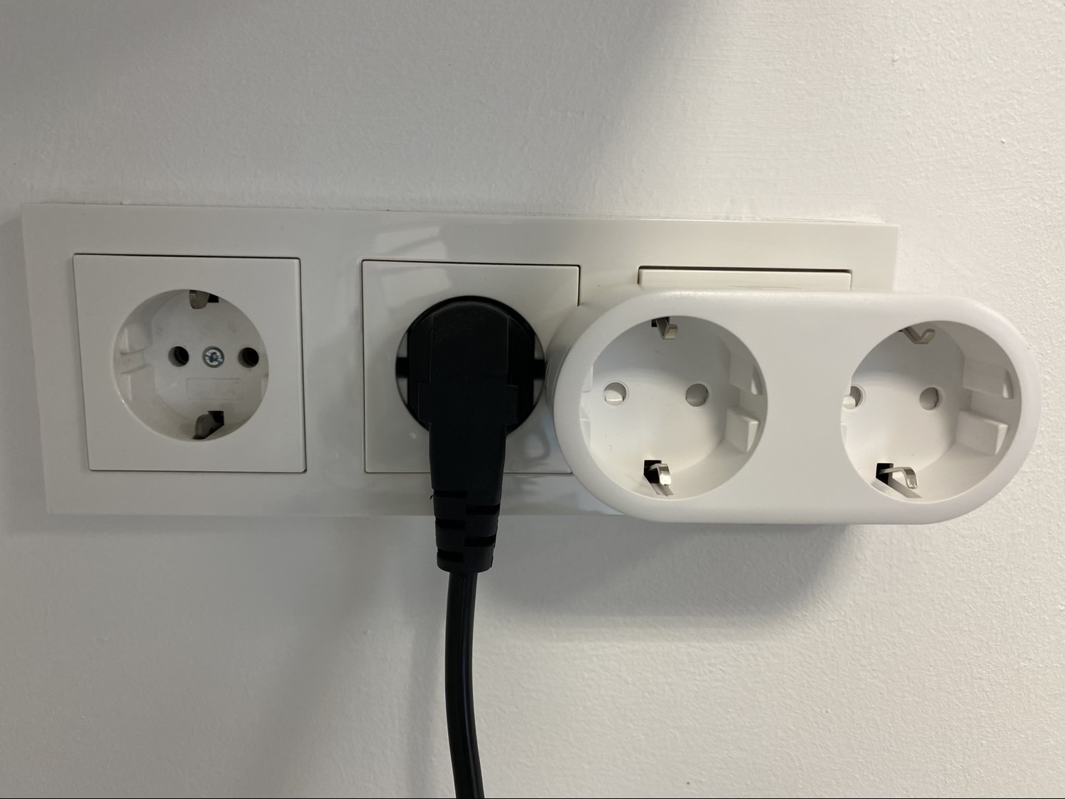 Mit der Doppelsteckdose könnt ihr aus einem Steckplatz zwei Steckplätze machen. Bei meinem Standard 55-Rahmen, bei dem drei Steckdosen nebeneinander angeordnet sind, verdeckt die Doppelsteckdose keinen zusätzlichen Steckplatz (auch wenn es auf dem Foto so aussieht). Hier werden aus drei Steckplätzen dann insgesamt vier, wobei zwei davon sich per HomeKit schalten lassen. Die genauen Abmessungen betragen 10,5 x 5 x 8,4 Zentimeter, das Gewicht liegt bei 180 Gramm. Ein CE-Zeichen ist aufgedruckt.