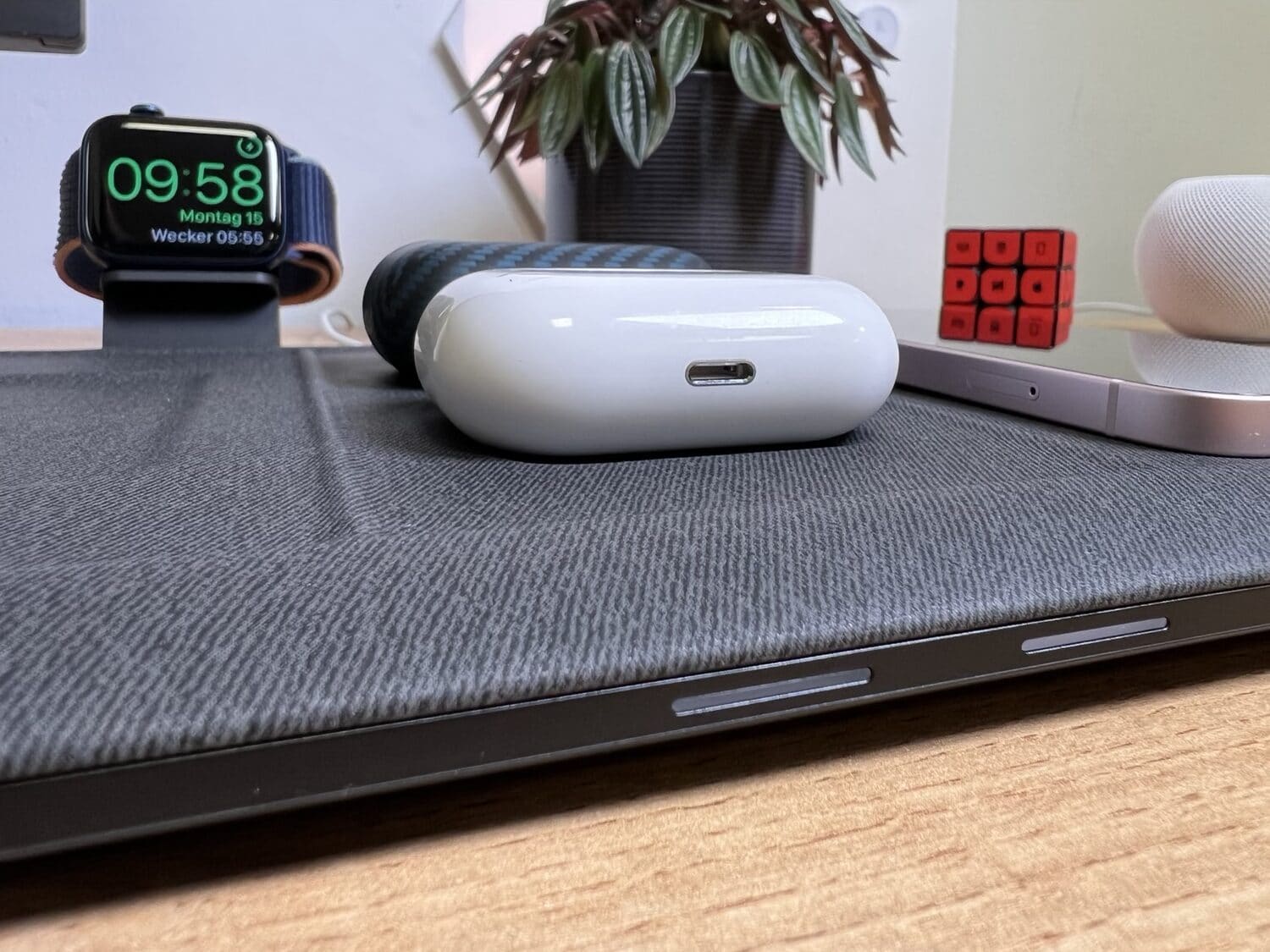 Einmal angeschlossen, könnt ihr auf der Matte zwei Smartphones und zwei Kopfhörer platzieren. Rechts und links gibt es jeweils bis zu 10 Watt, iPhones werden mit 7,5 Watt aufgeladen. Das 6,7″ iPhone Pro Max passt exakt auf die Ablage, etwas größere Smartphones können aber auch abgelegt werden. In der Mitte gibt es zwei kleine Ladekulen, um zum Beispiel die AirPods, AirPods Pro oder andere Qi-kompatible Kopfhörer aufzuladen.
