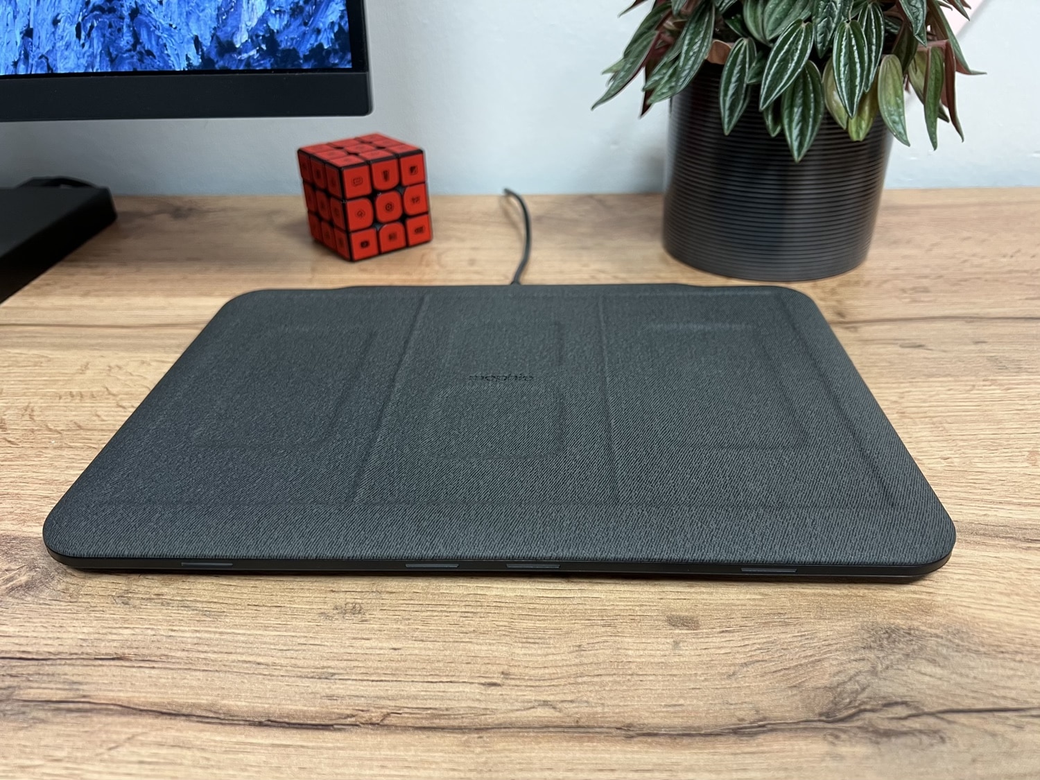 Die 28,2 x 19,2 x 1,6 Zentimeter große Ladematte bietet eine Stoffoberfläche an, auf der man seine Geräte ablegen kann. Auf der Front findet ihr vier LEDs, die anzeigen, ob die Gerätschaften richtig aufliegen und zuverlässig geladen werden. Hinten findet ihr den Ladeanschluss und einen zusätzlichen USB-A-Anschluss. Die Unterseite ist gummiert, damit die Ladematte nicht verrutscht.