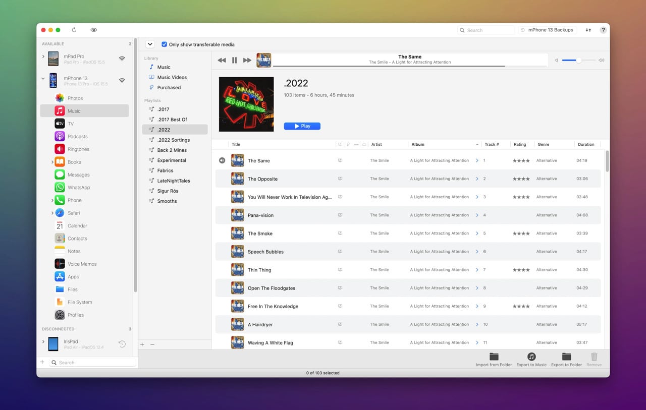 Weiterhin könnt ihr Musik einfach via Drag-and-Drop zwischen Mac und iOS-Gerät bewegen. Ab sofort gibt es auch einen Musik-Player, mit dem ihr Musik abspielen oder vor dem Übertragen in den Song hinein hören könnt. Gleichzeitig wurde die Ansicht optimiert, die Playlist-Wiedergabe verbessert, Hörbücher in den Bereich Bücher verschoben und einige Filter hinzugefügt.