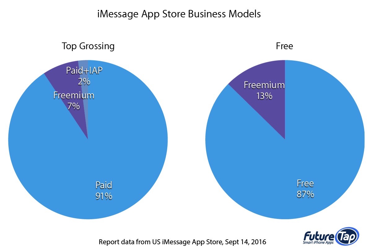 Ebenfalls interessant ist das Bezahlmodell der Apps. „Im Gegensatz zum iOS App Store, in dem Freemium-Apps am umsatzstärksten sind, kommt ein Großteil des Umsatzes im iMessage App Store von kostenpflichtigen Downloads. Das erinnert mich an die Anfangstage des App Stores, als es noch gar keine In-App-Käufe gab.“
