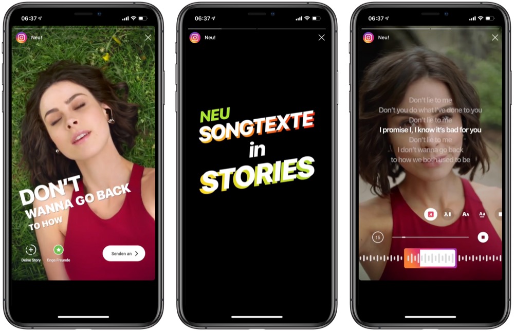 Wer Musik zu seiner Instagram Story hinzufügen möchte, hat eine große Auswahl an Songs. Während zuvor ein einfacher Sticker auf den Küster und Songname aufmerksam gemacht hat, kann man jetzt sogar Songtexte hinzufügen. Hat man den 15 Sekunden langen Abschnitt ausgewählt, kann man zudem die Schriftart wählen, wie der Songtext angezeigt werden soll.