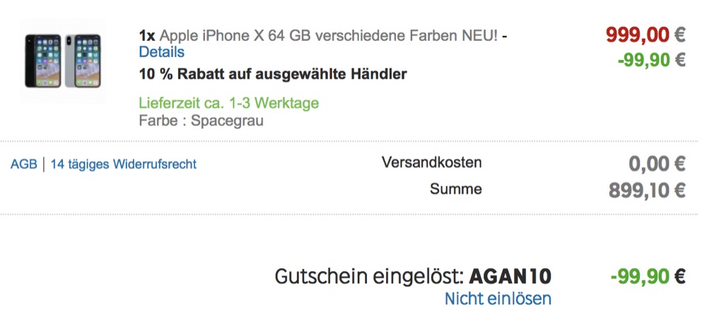 - iPhone X mit Gutschein AGAN10 für 899 Euro (zum Angebot)