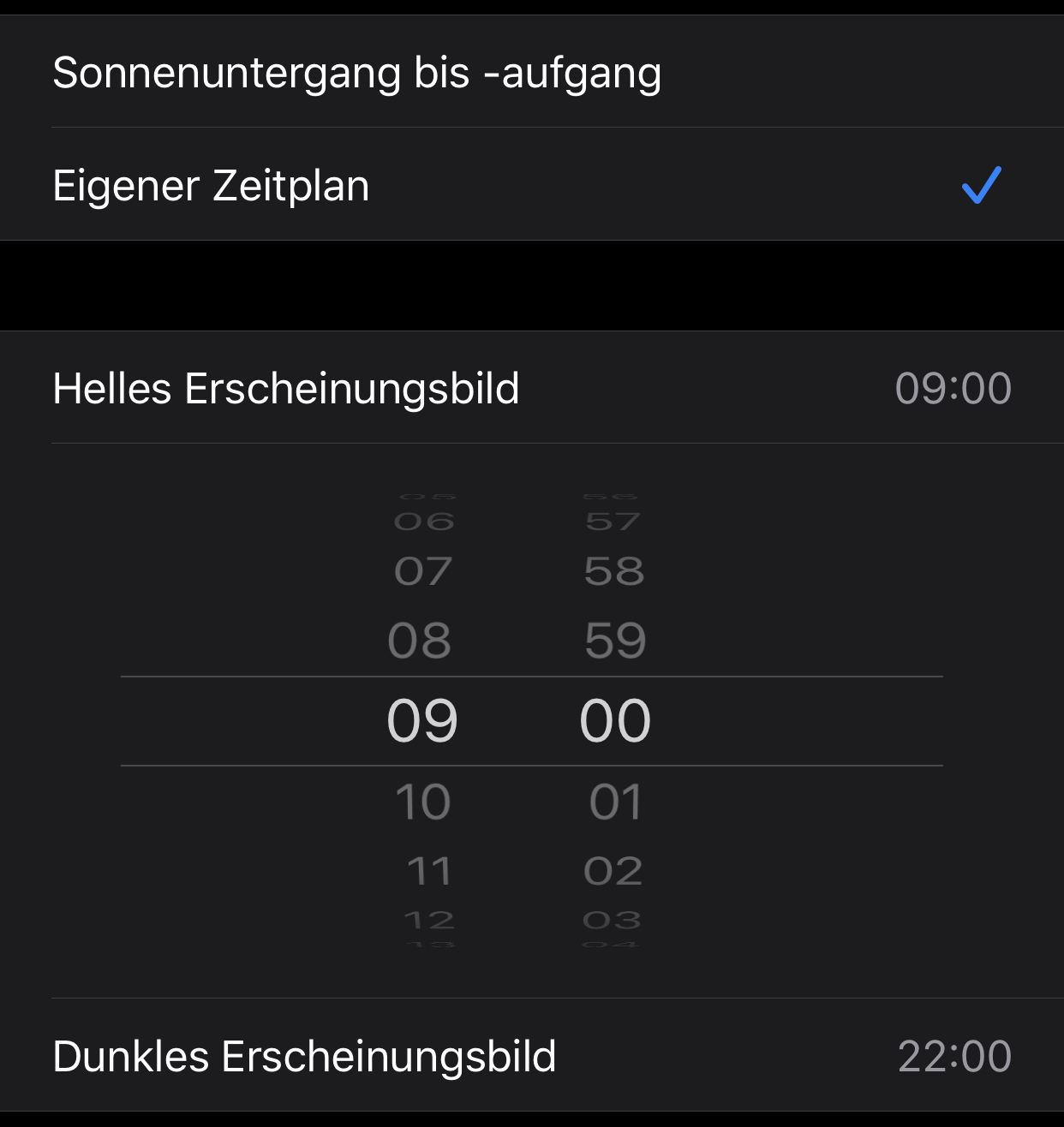 Hier könnt ihr selbst entscheiden, um wie viel Uhr das helle und ab welcher Uhrzeit das dunkle Erscheinungsbild angezeigt werden soll. Das ist jedoch nur pauschal für alle Tage möglich, individuelle Tageseinstellung gibt es nicht.