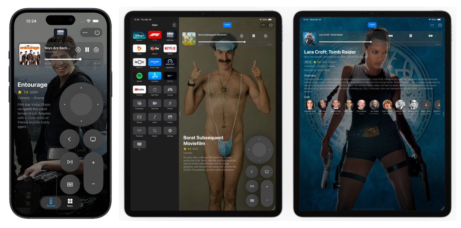 Ein zentrales Feature von Itsytv ist die direkte Anzeige dessen, was gerade auf dem Apple TV läuft. Während der Wiedergabe zeigt die App automatisch Hintergrundinformationen wie Titel, Handlung, Bewertung, Genres und Besetzung des aktuellen Films oder der Serie an, ohne die Fernbedienung verlassen zu müssen. Mit einem einfachen Tipp auf den Info-Bereich öffnet sich eine detaillierte Ansicht mit Fotos der Schauspieler und weiteren Credits. Besonders praktisch ist auch die Möglichkeit, die Wiedergabe per Touch zu steuern: Nutzer und Nutzerinnen können die Suchleiste ziehen, um direkt zu einer bestimmten Stelle im Inhalt zu springen, ohne wie bei der Siri-Fernbedienung die Taste gedrückt halten zu müssen.