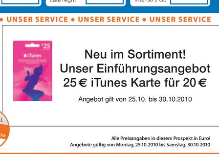 Wie unsere iFun-Kollegen im Müller-Prospekt für die nächste Woche entdeckt haben, gibt es bei der Drogerie-Kette iTunes-Karten im Wert von 25 Euro für 20 Euro. Das wäre immerhin ein Rabatt von 20 Prozent. Müller-Filialen könnt ihr hier finden.