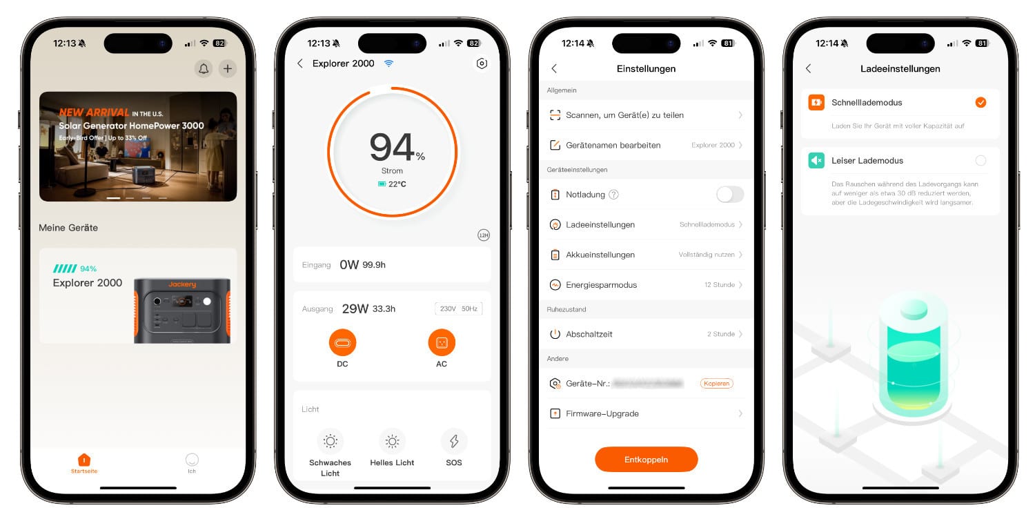 Über die Jackery-App sind auch weitere Einstellungsmöglichkeiten gegeben: So kann unter anderem festgelegt werden, wie lange das Display der Powerstation aktiviert bleiben soll (zwei Stunden, zwei Minuten oder komplett aus), die Lampe mit ihren drei Betriebsmodi ein- oder ausgeschaltet werden, Firmware-Updates unternommen, Lade- und Akku- und Energiespareinstellungen vorgenommen, ebenso wie der Gerätename bearbeitet und die Notaufladung aktiviert werden.