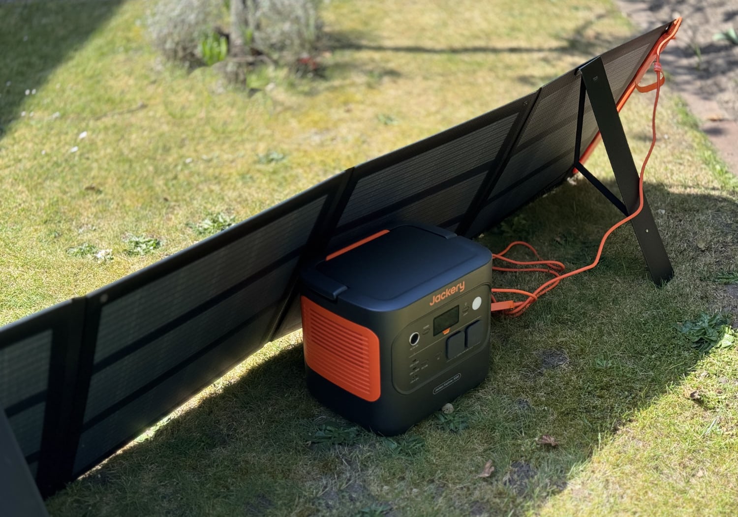 Besonders gespannt war ich aber auf die Leistung des 200 Watt-Solarpanels. An einem durchweg sonnigen Tag habe ich daher das Panel in Richtung Sonne aufgestellt: Erfreulicherweise hat Jackery an alles gedacht und zwei aufkklappbare Ständer für das Panel auf der Rückseite integriert. Zusammen mit der mittig aufgestellten Powerstation hinter dem Solarpanel, das dadurch zudem im Schatten steht, ist für einen sehr sicheren Stand gesorgt. Dann heißt es nur noch, das Kabel des Solarmodus in die Powerstation einzustecken, diese anzuschalten – und der Strom fließt. Und wie: Ich konnte an einem Tag sogar über 200 Watt an Sonnenstrom generieren.
