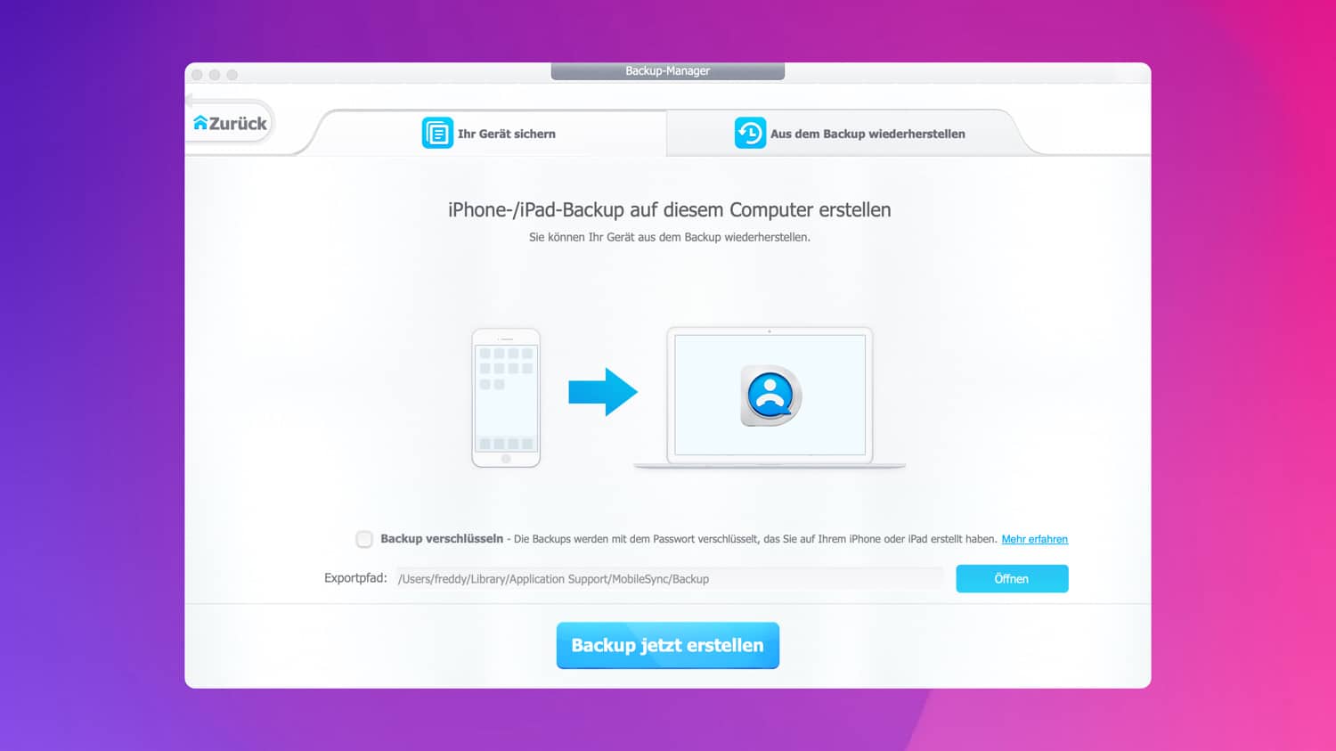 Im Programm gibt es einen speziellen Bereich nur für Backups. Ihr habt die Möglichkeit, ein Backup über WLAN durchzuführen, jedoch geht es per Kabel deutlich schneller. Sobald das iOS-Gerät verbunden ist, könnt ihr außerdem festlegen, ob das Backup verschlüsselt werden soll und in welchem Ordner es gespeichert wird. Der Vorgang kann je nach Datenmenge und Dateianzahl etwas mehr Zeit in Anspruch nehmen.