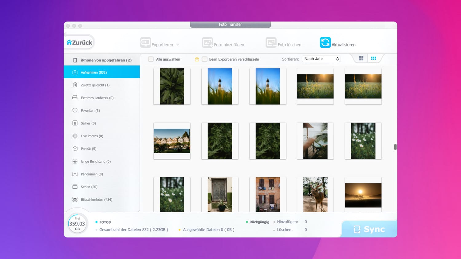 Die Foto-Transfer-Funktion ermöglicht es euch, Fotos und Videos im Handumdrehen auf euren Mac zu übertragen. Besonders praktisch ist die Option, eure Mediathek nach Tag, Monat oder Jahr zu sortieren, sodass ihr gezielt Bilder eines bestimmten Zeitraums exportieren könnt. Die Dateien könnt ihr bequem per Drag-and-Drop auf euren Mac oder eine externe Festplatte verschieben. Alternativ lässt sich auch ein bestimmter Export-Ordner auswählen. Der Vorgang ist in der Regel sehr schnell, kann jedoch bei größeren Datenmengen etwas mehr Zeit in Anspruch nehmen.